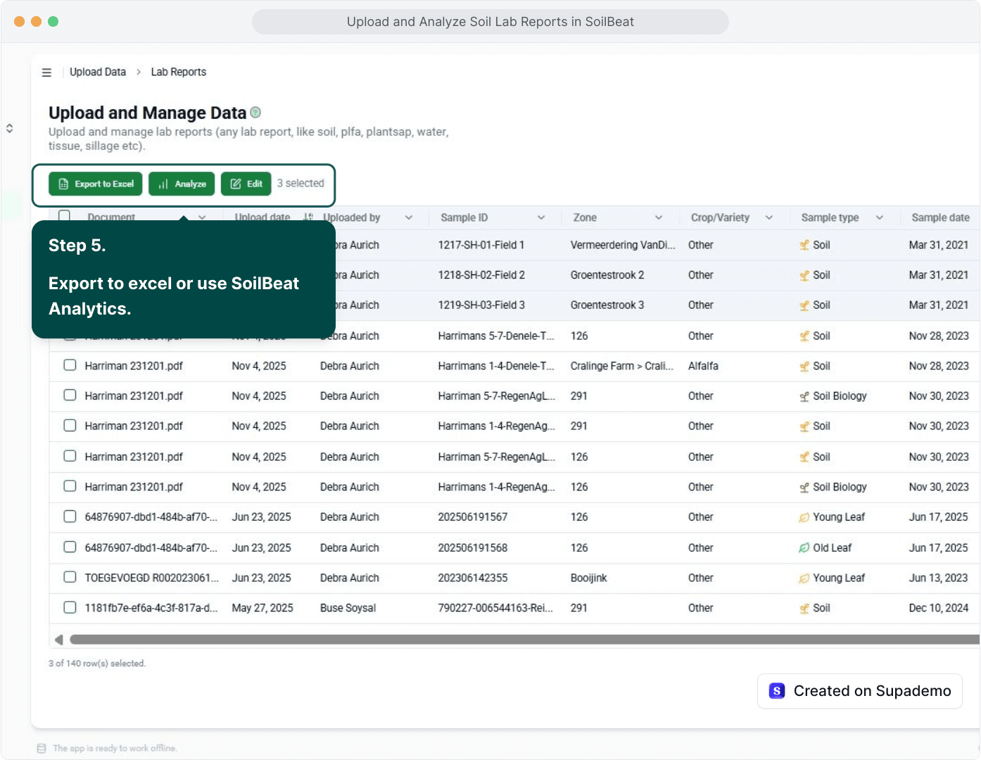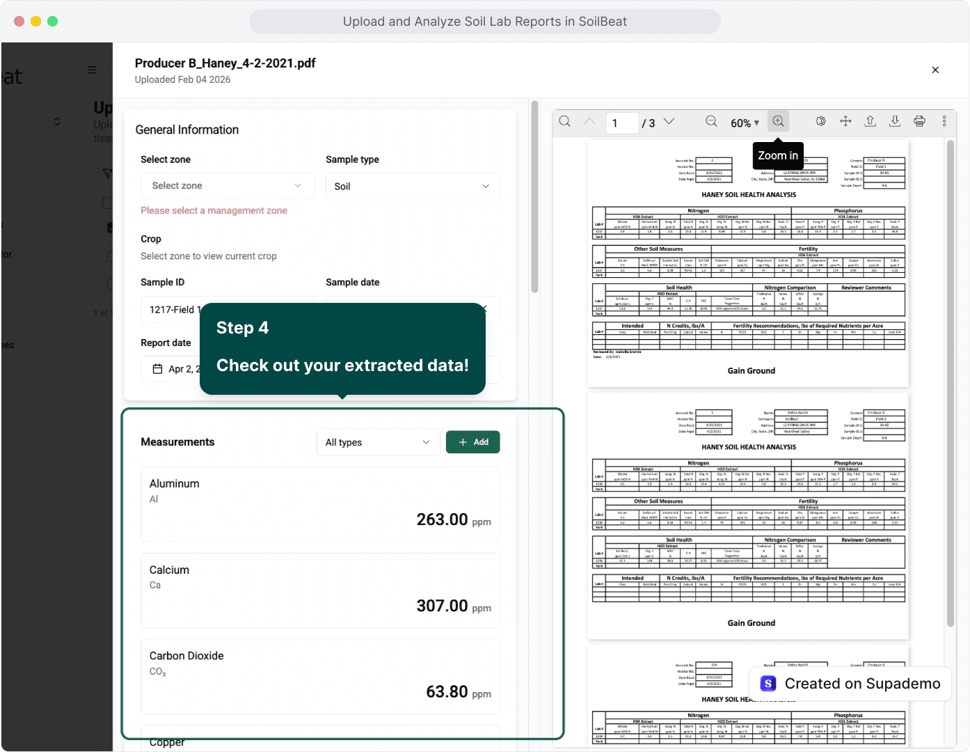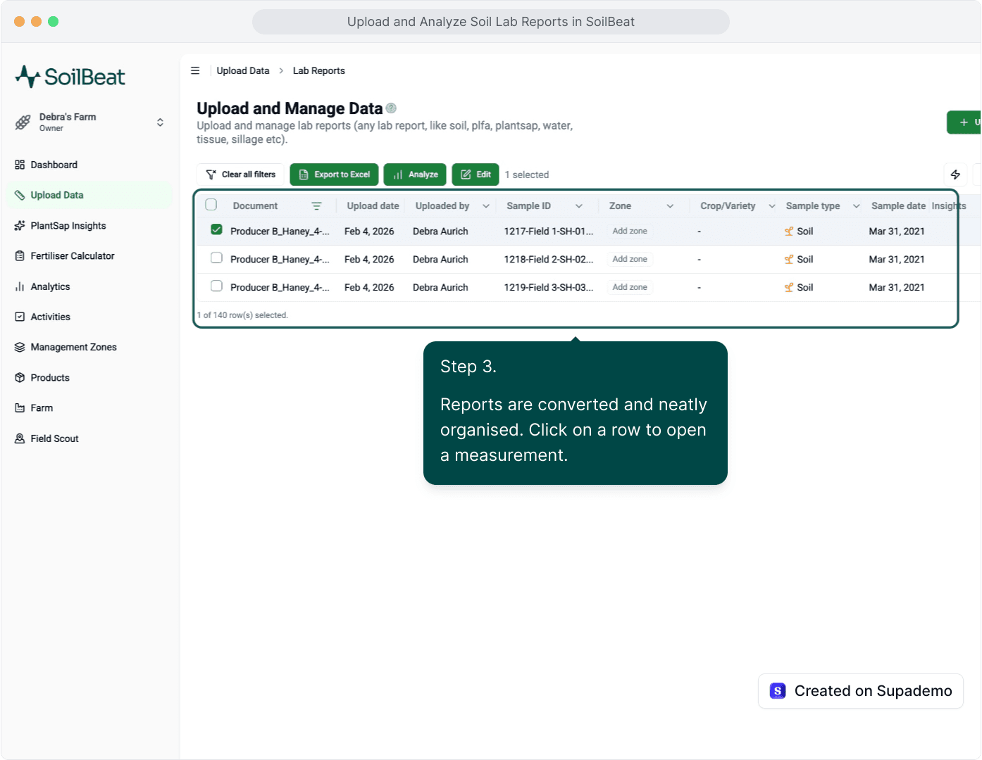 Analyze trends, track responses to fertilizer applications and other field actions, and identify which practices drive better soil health and crop outcomes — all without messy spreadsheets.