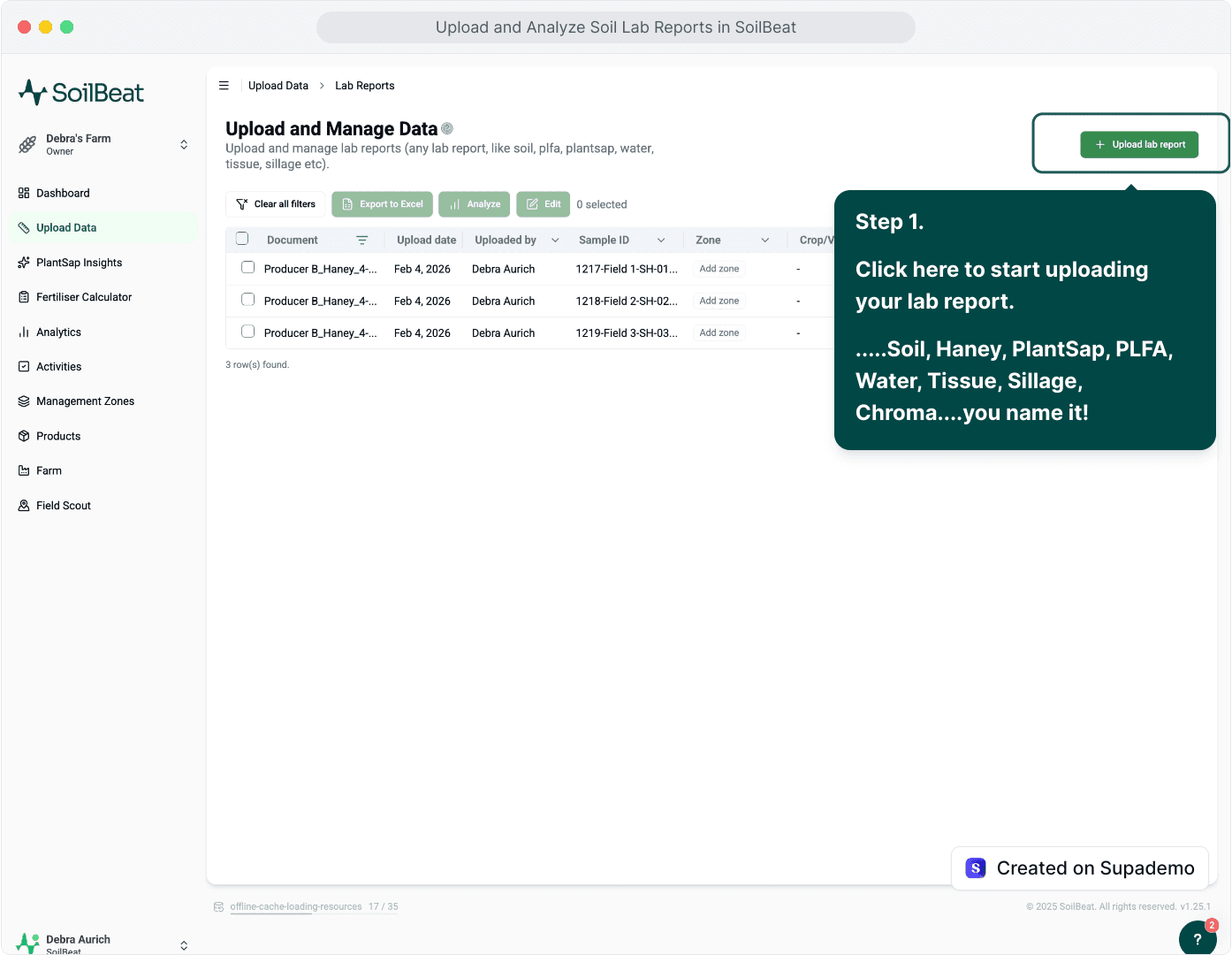 Data in agriculture is often scattered across files, notebooks, and spreadsheets. SoilBeat brings it all together—soil, sap, tissue, biology, silage, water tests, scouting notes, prescriptions, and field activities—assigning every data point to the right farm and management zone.
