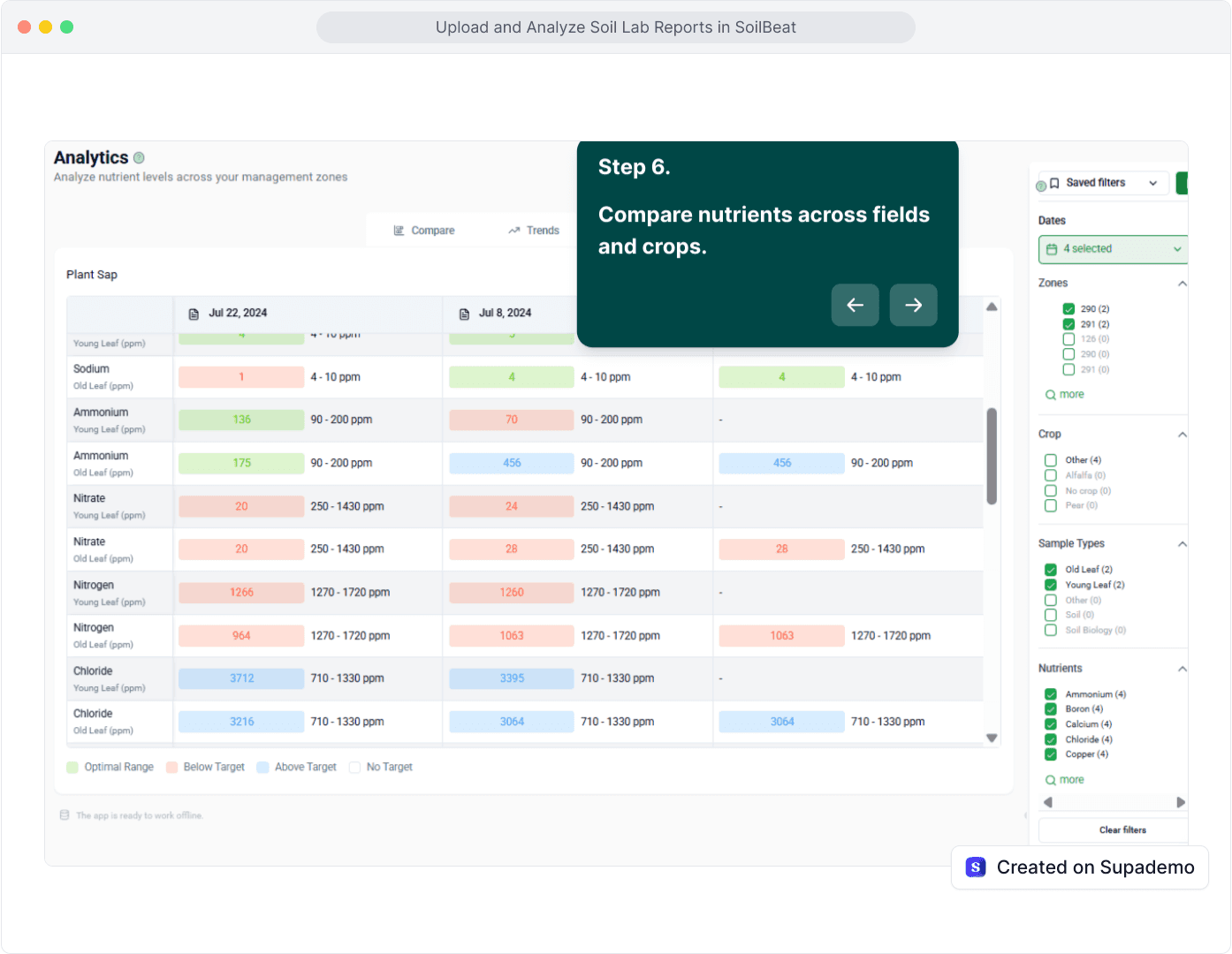 Compare nutrient trends and data across fields, seasons, and treatments